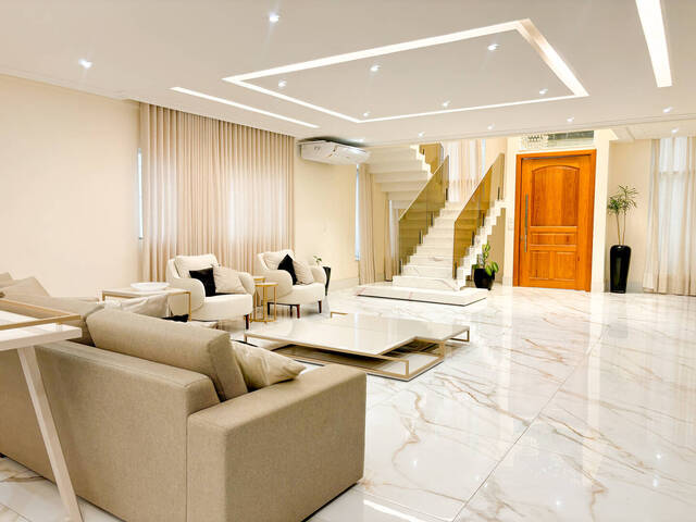 5 suítes, sala 2 ambientes, cozinha, área de serviço, 4 vagas de garagem.